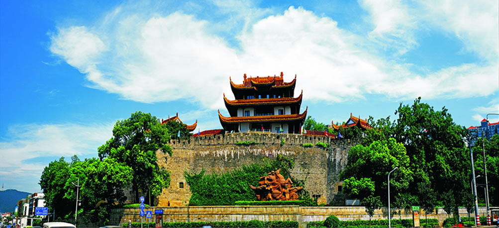天心阁是长沙古城的一座城楼。1983年重建。天心阁共有三层,总高17.5米,碧瓦飞檐,朱梁画栋,由60根木柱支撑,古色古香,造型别致。为长沙城标志性建筑,十大中国历史文化名楼。