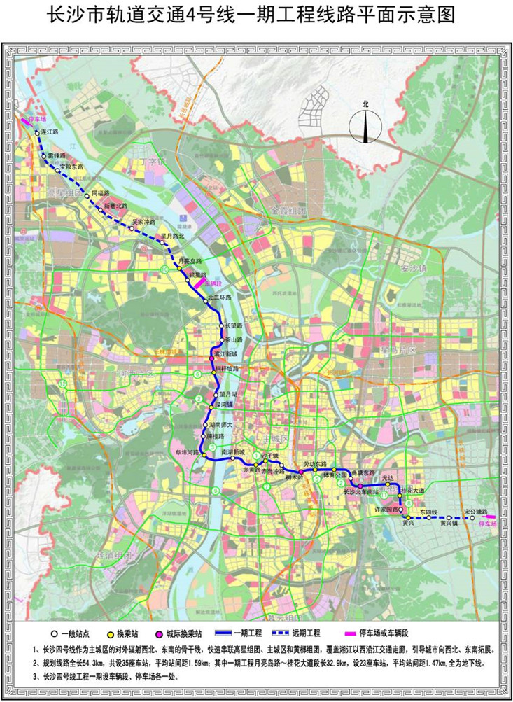 3号线一期工程从坪塘莲坪大道站至星沙龙角路站,线路全长约35.448km, 平均站间距为1.405km,设车站26座,其中地下站24座,高架站2座; 4号线一期工程西起北二环路站,东至桂花大道站,线路全长约31.96km,设置地下车站23座。