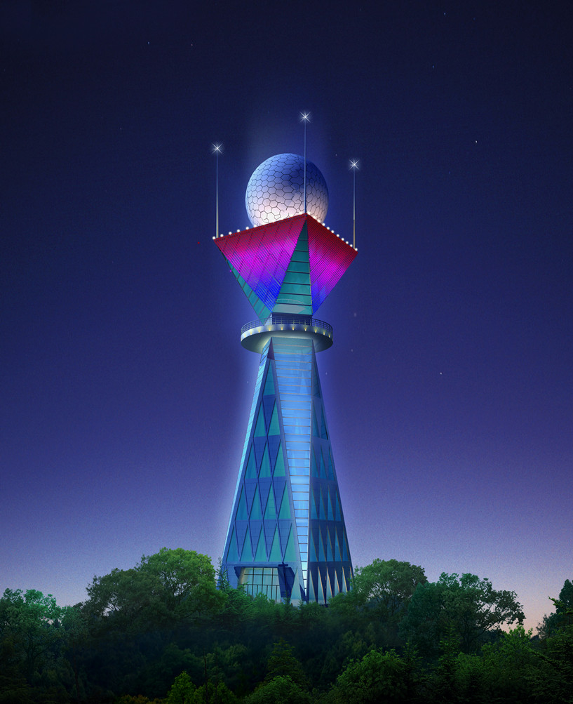 邵阳气象塔位于邵阳市孙家山山顶,亮化设计以气象雷达站为主体,遵循了五个原则,分别是整体性原则、节能环保原则、以人为本原则、主次兼顾原则和可持续性原则,本次设计形成了“生态之光、品质之光、特色之光、功能之光、科技之光”的光文化理念,营造生态型光环境。