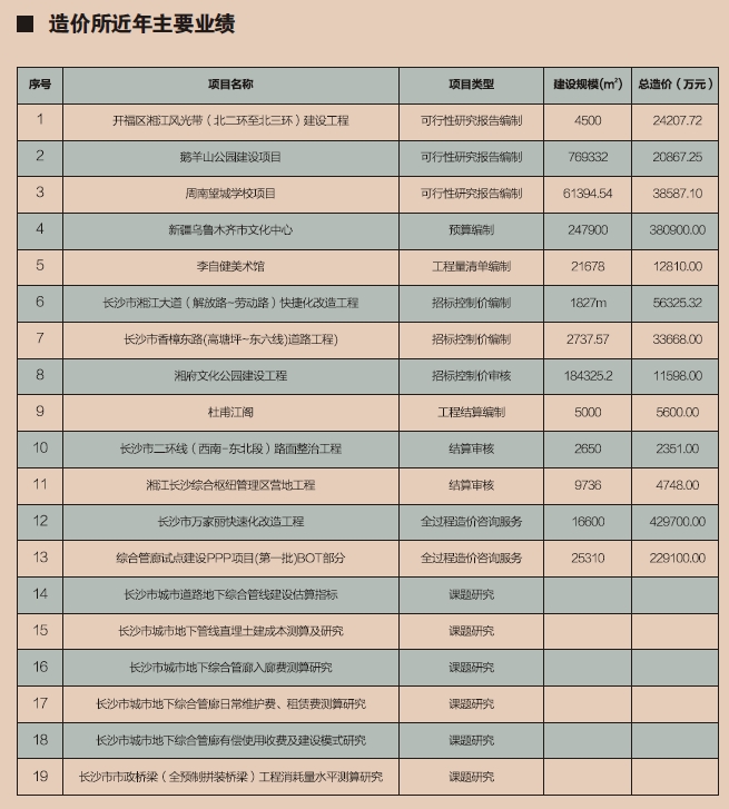 在工程造价领域,长沙市规划设计院有限责任公司具有造价咨询企业甲级资质。拥有一批高素质的专业技术人才,是一所集土建、安装、市政、园林绿化、公路、桥梁等各种专业人员于一体的工程造价咨询机构。承担过的政府投资项目相关课题研究有:《长沙市城市道路地下综合管线建设估算指标》、《长沙市城市地下管线直埋土建成本测算及研究》、《长沙市城市地下综合管廊入廊费测算研究》、《长沙市城市地下综合管廊日常维护费、租赁费测算研究》、《长沙市城市地下综合管廊有偿使用收费及建设模式研究》、《长沙市市政桥梁(全预制拼装桥梁)工程消耗量水平测算研究》。